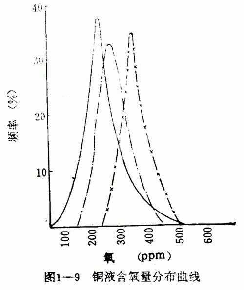 ETP銅桿含氧量要求在250-500ppm。從豎爐熔化出的銅液含氧量以100-200ppm為宜,爾后,在流轉(zhuǎn)中逐步吸入氧氣,直500ppm。一個(gè)典型的銅液含氧量控制曲線如圖1-9所示。